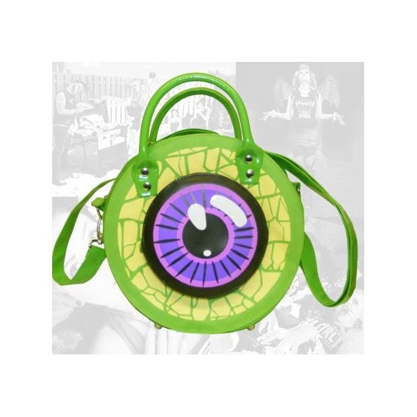 Kreepsville 666 vinyl eyeball bag with detachable shoulder strap, green satin kreepsville 666 lining, inside zip pocket and front eyeball pocket, overall size 24cm (dia), front pocket 14cm (dia).
