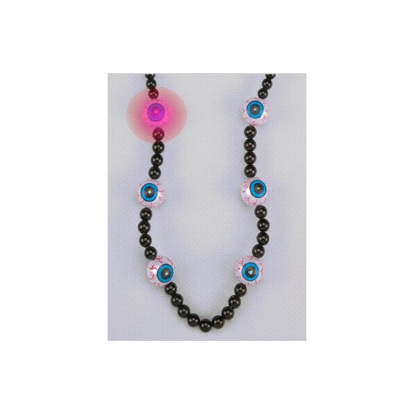 Press the button at the back of the neck and the eyeballs blink! Comes with 2 replaceable 1.5 volt watch batteries.