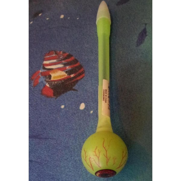 Hit the eyeball and it flashes! Green pen and eyeball with brown iris (photo is not correct).